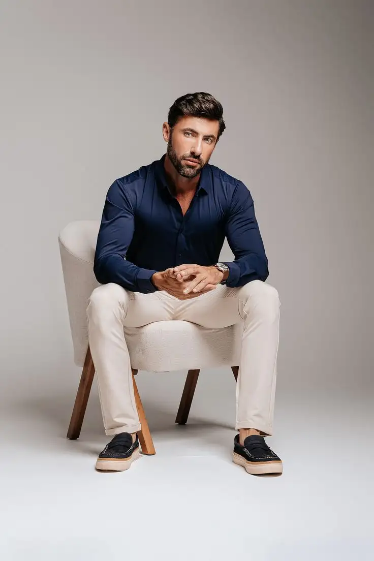 She wears a long-sleeved shirt in a neutral tone (beige, khaki, or light gray), with the top buttons undone to create a V-neckline. The bottoms are earthy-colored pants (brown or khaki), complemented by a brown leather belt with a large, prominent gold buckle (possibly with the letter 'V'). A gold chain hangs from the belt loops, adding a touch of glamour. The look is adorned with multiple bracelets on both wrists, combining metals and natural materials.