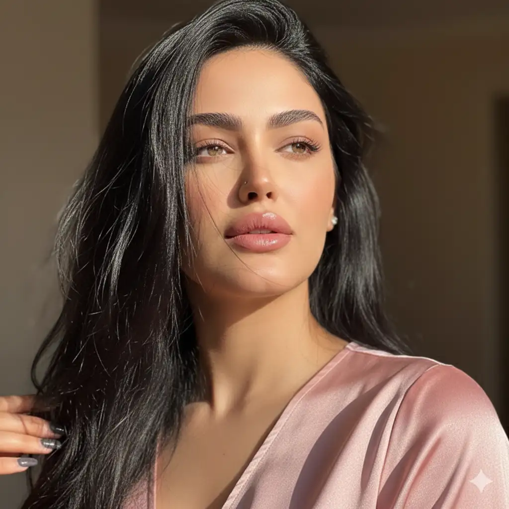 Her hair is long, with voluminous waves and a natural look, as if gently blown by the wind, framing her face. The makeup is natural yet defined, enhancing the beauty of her features. Beside her, a brown horse with a white marking on its face looks forward, in harmony with the figure.