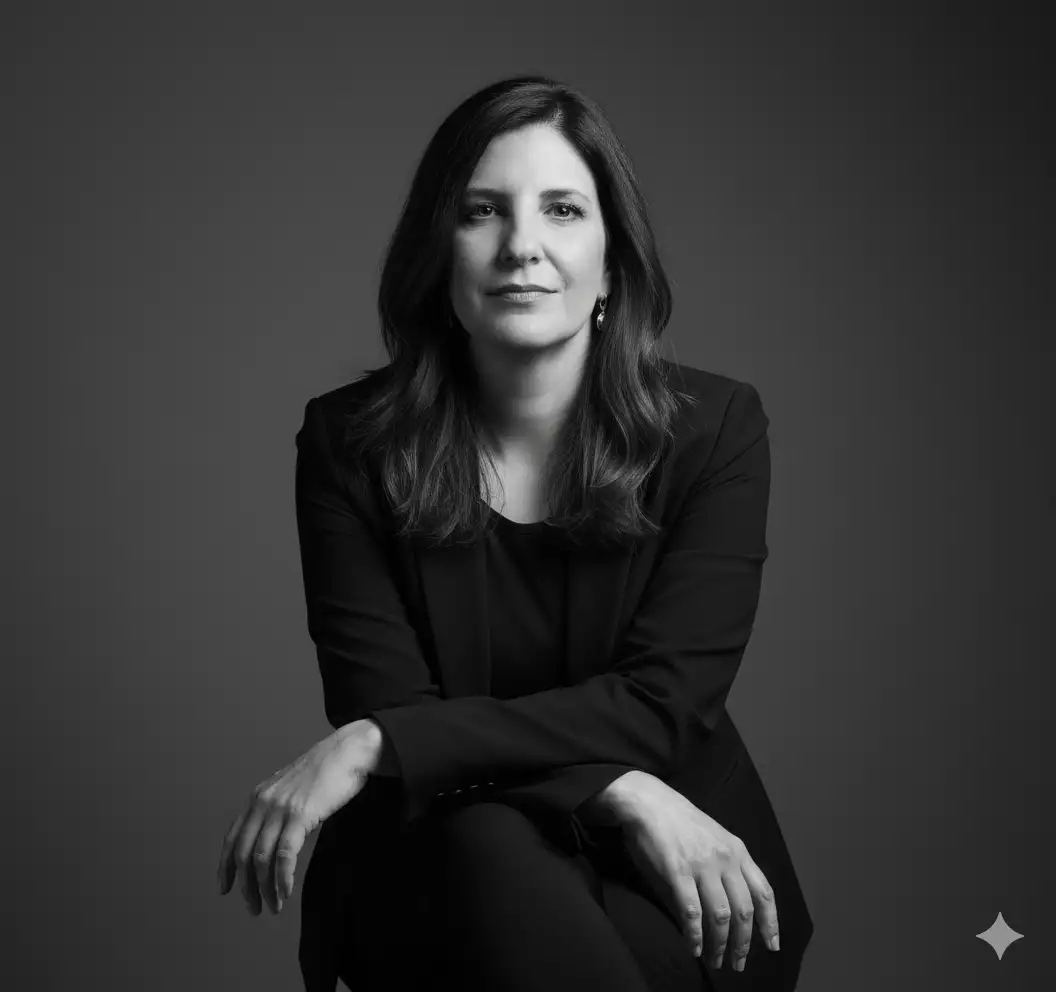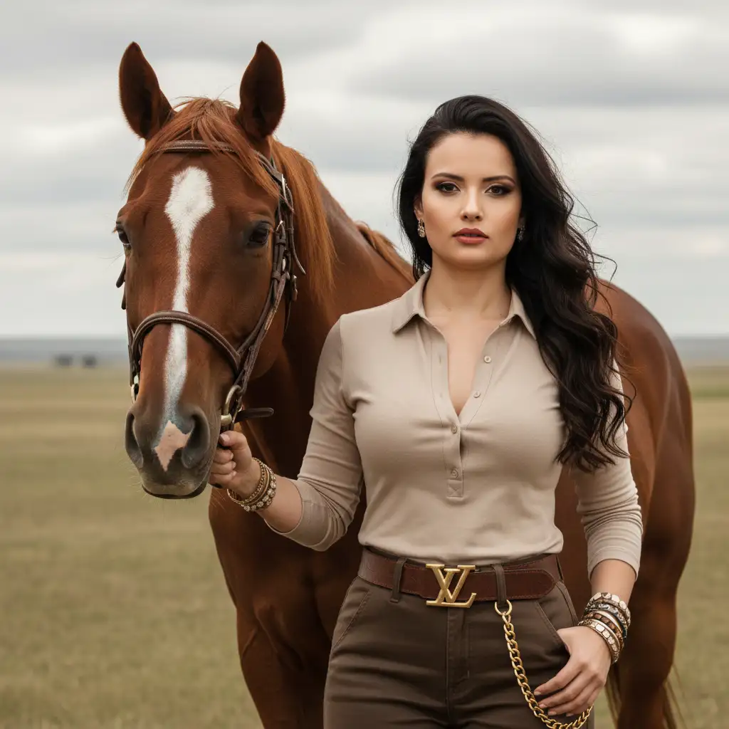 A cinematic, mid-length portrait, capturing a female figure with a strong and elegant presence, standing next to a horse. The subject faces the camera, with a direct and confident gaze. One hand gently holds the horse's halter or head, conveying a calm and powerful connection with the animal.